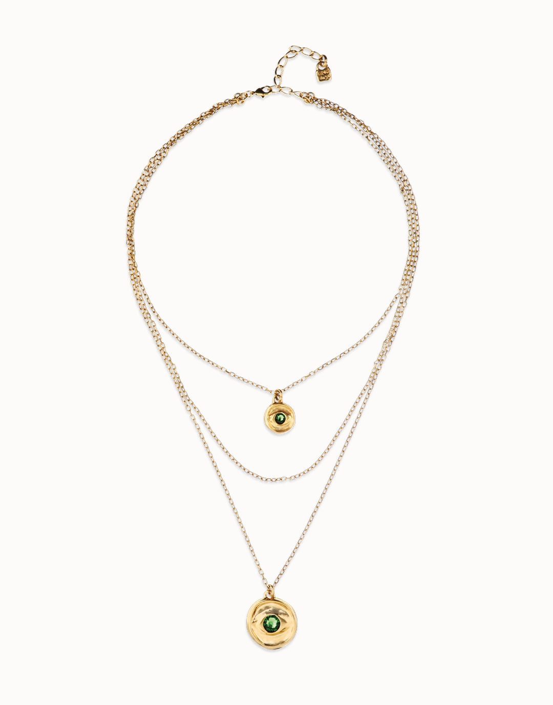 Ser Imparable Gold Tri Chain Layer Necklace w/Eye and Green Stone